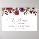 Adicione um toque pessoal à sua celebração de casamento com estes itens de na moda e festa memoráveis! Design apresenta flores de cor-de-água roxas, cor-de-rosa e púrpura, e verde sobre fundo branco.