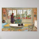 Menina regando flores coloridas na janela. Cores de água tipo primavera detalhados de Carl Larsson.