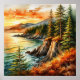Pintura aquosa vibrante de uma linha costeira florestal com árvores altas e penhascos rochosos, banhada em tons quentes do sol, abraçando a beleza serena da natureza e a tranquilidade do mar.