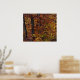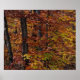 Esta poster apresenta uma adorável design impressionista de uma floresta de faia em cores brilhantes do outono de vermelho, marrom, amarelo e ouro. Alguns troncos castanhos escuros estão espiando pelas folhas.