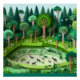 Este design mimetiza o olhar de uma arte em camadas de recorte de papel para criar uma exuberante cena florestal. Múltiplos tons de verde são usados para representar árvores, arbustos e o chão da floresta. Os detalhes insípidos incluem pequenos animais, pássaros e insetos escondidos em todo o local. O efeito em camadas dá a ilusão de profundidade, criando uma aparência 3D. Esta poster apela aos amantes da natureza, fãs de artesanato, e aqueles que buscam arte texturizada e atraente.