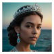 Um retrato digital ultra realista de uma jovem em três quartos, iluminado por uma iluminação muito quente e legal. Ela veste uma elaborada joia de prata polida, inspirada no oceano, adornada com turquesa, aquamarina e aglomerados de pedra lunar, incluindo uma tiara, brincos longos e um colar em camadas. Seu vestido lacrimogêneo se harmoniza com o crepúsculo suave e desfocado no fundo, criando uma elegância litorânea serena e luxuosa.