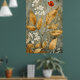 Pintura decorativa ou impressão artística de um ramo de carvalho com folhas outonais. Estilo: A obra de arte apresenta folhas de ouro brilhantes misturadas com tons mais quentes como marrom e laranja. Fundo: O fundo é texturizado com padrões sutis, reminiscente de papel pergaminho ou tela. Atmosfera: Esta é uma peça de design de interiores, ideal para criar uma atmosfera quente e natural.