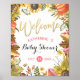 Modelos de Poster de Sinal de Boas-vindas do chá de fraldas - Escrito Dourado Elegante e queda de outono deixa Pumpkin Sunflower Watercolor Floral. Todo Estilo De Texto, Cores, Tamanhos Podem Ser Modificados Para Ajustado Das Suas Necessidades.