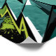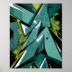 Um trabalho de arte dinâmico de grafite com formas geométricas nítidas, superfícies de cristal 3D e contrastes ousados de verde, turquesa, preto e branco. O fundo está cheio de vibrantes manchas e espalhamentos de tinta, criando um sentido de energia, movimento e caos no estilo da rua. Esta design de arte de abstrato combina a estética do grafite urbano com a abstração geométrica moderna.