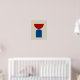 Uma design abstrato de arte moderna de formas geométricas vermelhas e azuis num fundo bege.
