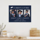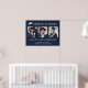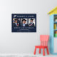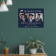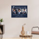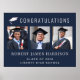 Elegante poster azul marinho festa de formatura para celebrar o formando. "PARABÉNS" está em grande tipografia branca com ilustração de um boné de formatura. Adicione três fotos e o nome do formando, ano de aula e nome da escola na tipografia branca moderna. As cores de fundo e texto podem ser editadas para corresponder às cores da sua escola editando na ferramenta design.