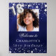 Um poster de boas-vindas para a 18ª festa de aniversário. Um fundo azul marinho com estrelas elegantes e falsas prateadas. A cor azul é irregular. Personalize e adicione uma foto, nome e texto. Cartas brancas. Traseira: sem design