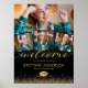 Poster personalizado de graduação de 2023 com boas-vindas apresentando um fundo na moda preto que pode ser mudado para qualquer cor, 4 fotos do formando, elegante brilho fino dourado, uma placa de massa e um simples modelo de boas-vindas que é fácil de personalizar.