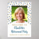 Poster de festa personalizada com dourado e confete azul.