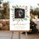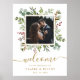 Este sinal de boas-vindas de casamento apresenta folhagem de eucalipto pintada em aquarela, folhas verdes, bagas vermelhas, ramos de pinheiro com uma moldura quadrada dourada. Para personalização mais avançada deste design, clique no link "Personalizar ainda mais". Itens correspondentes também estão disponíveis.