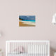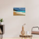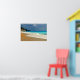 Poster com uma bela fotografia com um mar azul de turquesa e uma praia arenosa com ondas de surf de espuma.