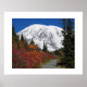 Impressão de pôster colorido com uma imagem fotográfica cênica do Monte Rainier coberto de neve e cores ardentes de outono em suas campinas subalpinas vistas de uma trilha de caminhada no Parque Nacional do Monte Rainier, Washington. Personalize o tamanho do seu pôster conforme desejado.