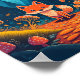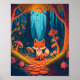 Poster colorida com uma raposa numa floresta com cogumelos. Ilustração de animais de cena noturna com estilo mágico e caprichoso. Decoração de parede ideal para o quarto de uma criança.
