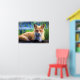 Um poster com uma imagem colorido da vida selvagem de uma raposa vermelha que se deita em gramíneas verdes. Esta criatura fofinha tem pelo macio e olhos gentis. A imagem tem uma sensação mágica sonhadora.