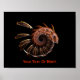 Uma imagem fractal espiralante (vermelha, amarela e laranja), de cor múltipla, parecida com uma ave ou um dragão de penas, sobre um fundo escuro. Personalize adicionando seu próprio texto. Você pode alterar a cor e a fonte do texto.