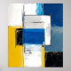 A burst of vibrant colors like yellow, blue, and white, interwoven with black strokes, forms an abstract composition reflecting chaos and balance. Paint layers suggest emotional depth and movement, inviting personal interpretation.