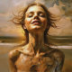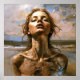 Fragmentos "Ophira" do mar. Essa imagem captura um momento em que a forma humana se dissolve nas texturas da água e da terra. Fala de transformação, da beleza da impermanência, e do poder bruto da natureza. Uma mulher perdida no abraço do mar, seu rosto erguido em direção ao sol ouro, se dissolvendo nos elementos. Esse trabalho de arte capta o delicado equilíbrio entre serenidade e erosão.