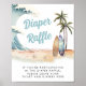 Um cartaz de fralda de chá de fraldas, com o tema do surfe, com uma cena tropical de aquarela com palmeiras, zonas arenosas e pranchas vibrantes e marrom, e "Raffle Fralda" um divertido roteiro azul.