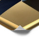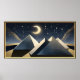 Pirâmides estilizadas, geométricas, lua crescente, constelações de estrelas, ouro mudado, matizes de marinho.