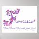 Lindo nome artístico com monograma F em pôster perfeito para o quarto ou sala de brincar de meninas em tons de rosa e roxo. Personalize com seu nome começando com F e o significado do nome para um toque verdadeiramente personalizado no quarto ou berçário do seu filho, este exemplo é para o nome Francesca Da França. Grátis, honesta, paciente e gentil. Impressão de pôster fofo ideal para um novo bebê, presente de batizado ou chá de bebê ou para o quarto de uma criança. © Desenho exclusivo de corações e flores com monograma F e design de arte gráfica por Sarah Trett. www.sarahtrett.com para www.mylittleeden.com