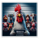 Um grupo de animadores de fazenda se posiciona diante de uma parede de linhagem, cada um com seu próprio cartaz de identificação. O personagem principal, um galo chamado Rosco, parece comicamente culpado no centro.