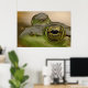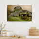 This poster features a close up of a green frog's eye as she floats in the pond on a hot summer day. Her iris is an incredible pattern of gold and yellow. The pure black oval pupil in the center reflects trees in the distance.