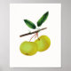 Duas maçãs Soulard brilhantes penduradas num galho de árvore com duas folhas verdes de cor média.