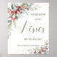 Este design apresenta uma ilustração em aquarela de frutas vermelhas de inverno e folhagem verde. No topo do cartão há uma imagem de confetes com efeito esverdeado e dourado. o texto Beijos é escrito em uma fonte manuscrita.