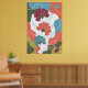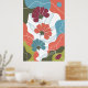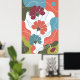 design de fundo abstrato com flores em burgundy, pêssego e azul no centro. Adequado para pendurar em qualquer sala que precise de um belo toque de cor.