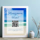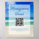 Uma bela foto das ondas do oceano decora este cartaz moderno de fundo para lua de mel de casamento de destino. Linda caligrafia cursiva azul sobre a fotografia tropical à beira-mar para o seu cartão de casamento na praia.