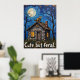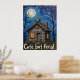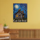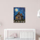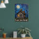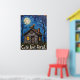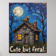 Este trabalho de arte espetacular mostra um guaxinim com a cauda anelada e o rosto mascarado, sentado no telhado inclinado de uma charmosa cabana de madeira. O fundo é um céu noturno detalhado com uma lua brilhante e luminosa de cheio. As palavras "Bonito mas selvagem" são exibidas em uma fonte divertida e estilizada na parte inferior da pintura. A cena é feita com escovas grossas e expressivas, criando um senso de robustez e tranquilidade.