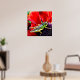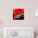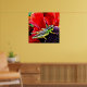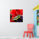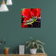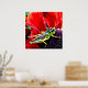 Este poster brilhante e colorido apresenta um gafanhoto verde-brilhante, amarelo e preto, pregado no centro roxo de uma flor com pétalas vermelhas lindas.