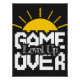 Game Over is depicted in bold, pixelated lettering, with the words “Level Up” creatively superimposed on it in an ornate script at its center and a sun shining behind it at the top. The design combines retro gaming aesthetics with a motivational twist.