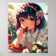 Uma anime bonita com cabelo preto e uma faixa de cabelos rosa com flores comendo morangos frescos num dia de verão. Bonita para qualquer garota que ama anime!