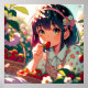 Uma anime bonita com cabelo preto e uma faixa de cabelos rosa com flores comendo morangos frescos num dia de verão. Bonita para qualquer garota que ama anime!