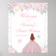 Esta elegante e glamourosa placa de boas-vindas do inverno, 16, apresenta uma bela princesa com cabelo castanho e pele clara num vestido de bola rosa. O texto combina o script manuscrito e as fontes sans serif modernas para um aspecto elegante e sofisticado. Os arranjos florais, flocos de neve e confete prateado criam a mistura perfeita de rústico e chic. Gráficos por www.etsy.com/uk/shop/SunflowerDayLove