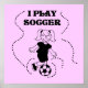 Um design de futebol preto-e-branco que apresenta uma jogadora de futebol feminino com uma bola de futebol e um texto que diz "Eu jogo futebol" em T-shirts, capuzes, canecas, cartões, autocolantes, sacos de tote, ímãs e muito mais.