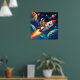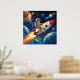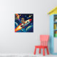 Poster Sci fi para o quarto de garotinho com um pequeno astronauta voando pelo espaço em um foguete feito de forma retrô-pop.