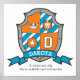 Cumeeira do escudo no estilo dos Cavaleiros letra D monograma arte nome poster perfeito para o quarto ou sala de brinquedos de um menino em tons de laranja, azul turquesa, branco e cinza. Personalize com o nome da criança e o significado do nome para um toque pessoal no quarto ou berçário da criança, este exemplo é para o nome Dakota Um amigo e aliado. Corajoso, confiável e digno de confiança. Impressão de pôster ideal como presente para um menino recém-nascido, batizado, nomeação de bebê, aniversário de menino ou presente de chá de bebê. Desenho único do escudo de arte gráfica de heráldica e design por Sarah Trett. www.sarahtrett.com para www.mylittleeden.com