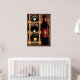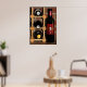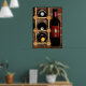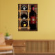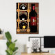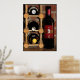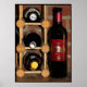 Este poster colorido apresenta uma vida tranquila simples de uma garrafa de vinho ereta próxima a mais três garrafas numa prateleira de vinho de madeira. Um fundo de tijolos rústico completa a composição.