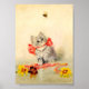 Poster com o trabalho de arte de Kitten de Meta Plückebaum com um Friso Vermelho (b. 1876). Uma gatinha cinza com listras escuras é lindamente adornada com uma fita vermelha. O gatinho brinca com uma abelha. Flores amarelas decoram o primeiro plano. Um presente maravilhoso para amantes de gatos e entusiastas de arte alemães!