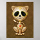 Este adorável design de gatinho marrom é decorado com espirais e padrões ponto. Pedais de flores amarelas circundam os olhos negros puros na tradição do Dia dos Pântanos de Açúcar Morto. O gato está sentado, olhando para frente com sua cauda acenando ao fundo. A cabeça grande se senta sobre um corpo minúsculo que cria uma aparência divertida, como um desenho. Uma estrela de cinco pontos fica no meio da testa do gatinho enquanto um coração vermelho e amarelo brilhante aparece no centro do peito. Este gatinho bonito é um design divertido e na moda inspirado pelas belas padrões do Dia dos Pelos Crânios do Açúcar Morto.