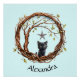 Um gatinho preto giro sentado em uma coroa tecida assiste uma estrela prateada pendurada em um galho de árvore.
