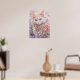 Um poster com uma bela ilustração. Um gato branco de cabelos compridos que parece real e elegante. Cercado por flores cor-de-rosa, joias de ouro e diamante.