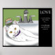 Gato branco sentado na pia do banheiro. O amor não está ligando a água...Até pensava que queria mesmo.