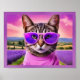 Poster com arte de fantasia caprichosa. Um gato-jazz em um galo de lágrimas e óculos de sol roxos se coloca contra um pano de fundo de um campo de lavanda. Perfeito para quem ama gatos modernos, humor e vibrações no início do verão. com fantasia fantástica.
