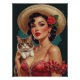 Esta ilustração impressionante retrata um pino-up mexicano glamouroso em um conjunto inspirado em vintage. Ela faz um sombrero muito brilhante com intrincada trim de rendas, evocando a tradicional elegância mexicana. Suas cordas escuras e brilhantes enquadram seu rosto sem defeitos, realçado por lábios vermelhos ousados, delineador alado, e um olhar suave que lembra as estrelas clássicas de Hollywood. Uma rosa vermelha vibrante enfiada no cabelo dela adiciona um toque romântico. Ela veste um vestido opulente de cetim vermelho com delicado bordado de rendas e capas esfregadas fora do ombro, exuindo sofisticação e altruísmo. Em seus braços, ela agarra graciosamente um gato regal e fofo com olhos verdes piercing, adicionando charme e mistério à cena. O fundo verde cria um contraste impressionante, melhorando ainda mais a estética rica e vintage deste retrato cativante do México.