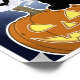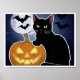 O design apresenta um gato preto sentado ao lado de uma abóbora esculpida com um rosto sorridente. O fundo inclui um céu noturno com lua de cheio e vários morcegos voadores. A imagem provavelmente representa os temas do Dia das Bruxas, dada a presença do gato negro, muitas vezes associado à superstição e ao feriado, e do jack-o-lanterno, que é uma decoração comum do Dia das Bruxas. A lua de cheio acrescenta à atmosfera sombria que tipicamente se divertiu durante as comemorações do Halloween.