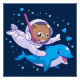 Gato submarino e poster de golfinhos. Um mergulhador do mar profundo de gato cavalgando um golfinho. Design de fantasia bonita.